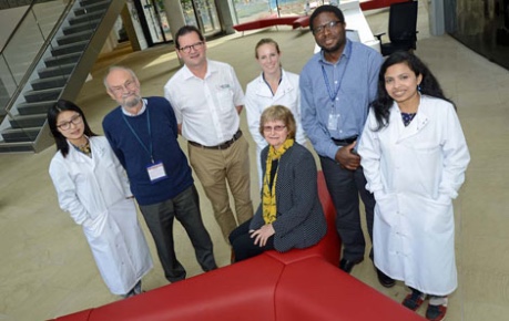 Pictured from left to right: Dina DuYue (PhD student - The Roslin Institute), Sir Ed Southern, John Mackenzie (CEO - Roslin Innovation Centre), Nicola Mawson (Under Graduate - Royal (Dick) School of Veterinary Studies), Professor Appolinaire Djikeng (Director of CTLGH), Chandana Basu (Post Doc - The Roslin Institute) and seated, Lady Southern.